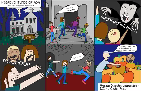 Ada entered the haunted house and felt an eerie thickness in the air around her. A vampire jumped out and she screamed. Then a zombie jumped out and Ada was done. She took off running and later her friend found her huddled next to a pumpkin patch. She breathed heavily, her eyes wide, and her face pale. Luckily, her friend called the paramedics. Be careful out there, Ada, there are things that go bump in the night.