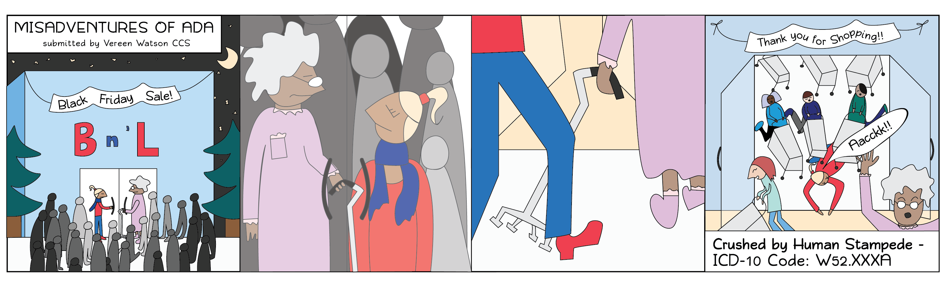 In this special holiday edition of The Misadventures of Ada, suggested by, Vereen Watson, CCS, Ada braves the crowds to attempt a little black friday shopping. Ada arrives early, ready to knock off her entire holiday list with her cart ablazing as she waits for the doors to open. Once they do, things quickly go south for poor Ada.